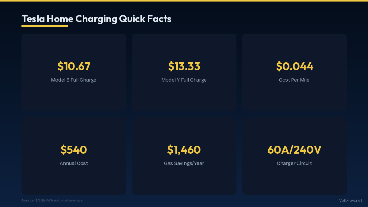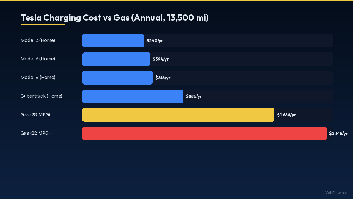 Charging a Tesla at home is one of the biggest financial advantages of owning an electric vehicle. In 2026, the average cost to fully charge a Tesla ranges from $7-$10 for a Model 3 to $14-$18 for a Model X or Cybertruck, depending on your local electricity rate. That translates to roughly $30-$60 per month for typical driving, compared to $150-$250 per month for gasoline. This guide breaks down the exact charging costs by model, electricity rate, and charging method so you can calculate your specific savings.