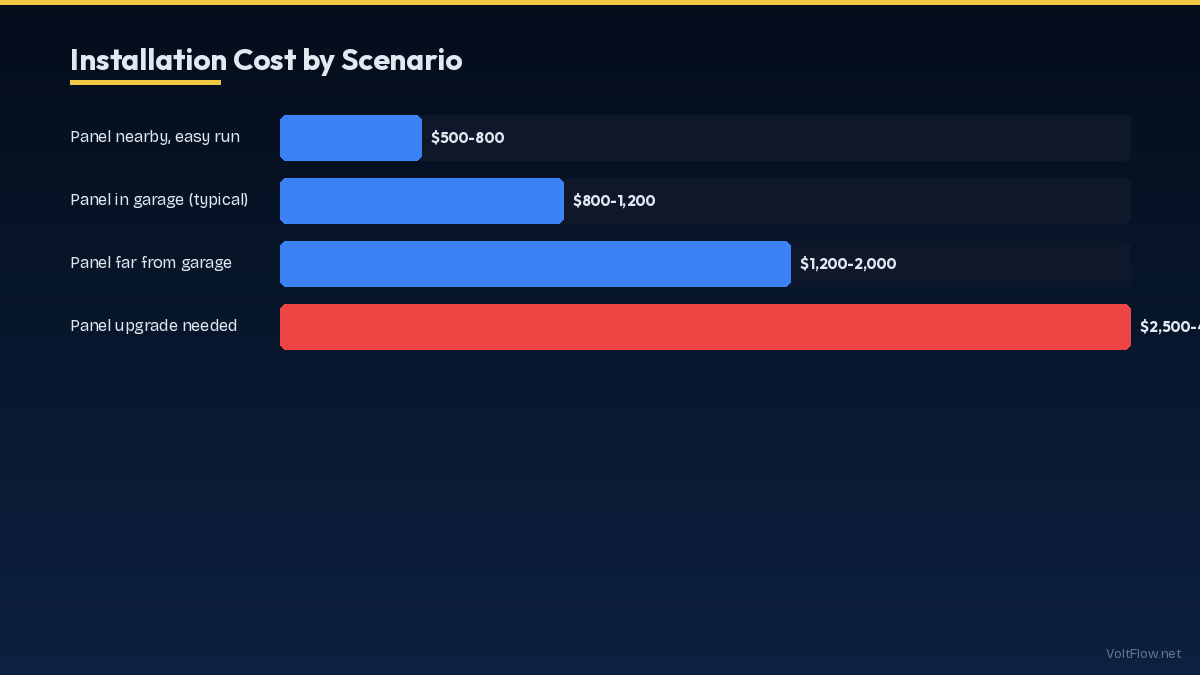 The electrical work is typically the larger portion of total installation cost and varies significantly based on your home electrical situation. The simplest installation involves mounting the charger near your electrical panel in a garage that already has panel capacity and clear access. In this best-case scenario, an electrician runs 6-gauge wire a short distance from the panel, installs a 50-amp double-pole breaker, and mounts either a NEMA 14-50 outlet or hardwires the charger directly. Total electrical labor and materials cost is $500-$800 for this straightforward scenario. Most homes fall into the moderate complexity category at $800-$1,400 in electrical costs. This covers situations where the panel is not in the garage, requiring a longer wire run through walls, attic, or crawlspace. Every additional 10 feet of wire run adds approximately $30-$50 in materials and $50-$100 in labor. A 40-foot run from a basement panel to the garage is a common scenario that pushes costs toward the higher end. Complex installations at $1,400-$2,500 involve additional work like running conduit along exterior walls, trenching underground conduit to a detached garage at $15-$25 per linear foot, or installing a sub-panel in the garage. If your main panel is already full and has no available breaker slots, you may need a tandem breaker swap at $100-$200 or a sub-panel addition at $500-$1,200. The most expensive scenario is when the main panel needs upgrading from 100 amps to 200 amps because there is not enough total capacity for the EV charger. A panel upgrade adds $1,800-$3,500 on top of the charger circuit cost. Before getting quotes, check your panel for available 240-volt breaker spaces and total amperage capacity. This information helps electricians provide accurate quotes without a site visit. Materials for a typical installation include a 50-amp double-pole breaker at $15-$25, 6/3 NM-B copper cable at $2.50-$3.50 per foot for interior runs or 6-gauge THWN wire in conduit for exterior runs, a NEMA 14-50 outlet at $12-$18 if using a plug-in charger, and miscellaneous boxes, connectors, and cable clamps at $30-$60. Total materials for a 30-foot run is approximately $120-$180, meaning the majority of installation cost is labor.