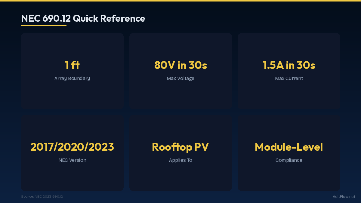 NEC 690.12 establishes two zones: Inside the array boundary: Under NEC 2020+, all conductors must reduce to 80V or less and 1.5A or less within 30 seconds of initiating rapid shutdown. This requires module-level power electronics (MLPE) — either microinverters or DC optimizers with rapid shutdown capability. Outside the array boundary (more than 1 foot from the array): Required since NEC 2017, conductors must de-energize to 30V within 30 seconds. The rapid shutdown initiation point must be at a readily accessible location — typically the main service disconnect or a clearly labeled rapid shutdown switch.