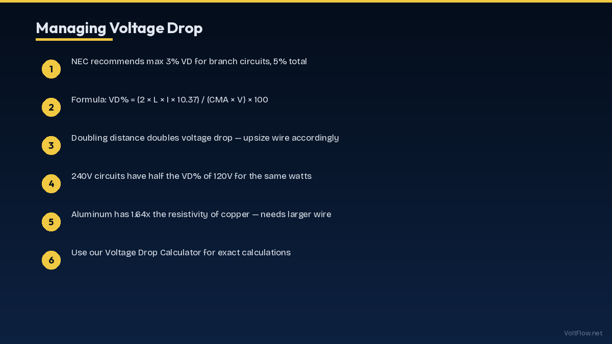 Voltage drop is the silent performance killer in electrical systems. Every foot of wire between your panel and a device adds resistance that reduces the voltage reaching the equipment. The NEC recommends keeping voltage drop below 3% for branch circuits and 5% total from service entrance to the farthest outlet. On a 120-volt circuit, 3% equals just 3.6 volts — enough to make motors run hot, lights dim, and sensitive electronics malfunction. This guide covers the voltage drop formula, NEC recommendations, wire sizing for long runs, and practical solutions.